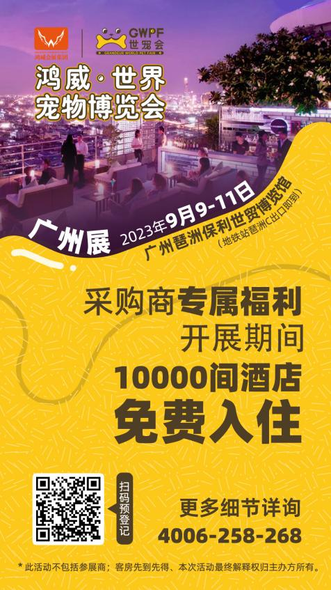 2023年9月9日-11日,廣州保利世貿(mào)博覽館,10萬+愛寵人士和5萬+采購商都會來的鴻威?世界寵物博覽會(GWPF世寵會),熱忱期待您的加入,和我們一起見證國內(nèi)寵業(yè)品牌的誕生與成長,多城聯(lián)動,商貿(mào)交流,對話全球,加速國際化戰(zhàn)略進程,共筑引領(lǐng)世界風(fēng)向的寵業(yè)新標(biāo)桿!